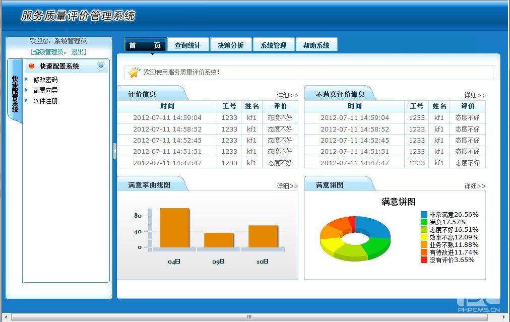 后台管理系统采用模块化的设计理念,将类似的功能归纳实现为一个部分,最终组成功能完整的后台管理子系统。将评价数据管理后台、员工信息管理后台、多媒体数据发布后台、监控信息管理后台等多平台融合一身,将他们的优势和功能有机结合在一起,成为本年度真正意义上的“新型多媒体评价管理平台”。