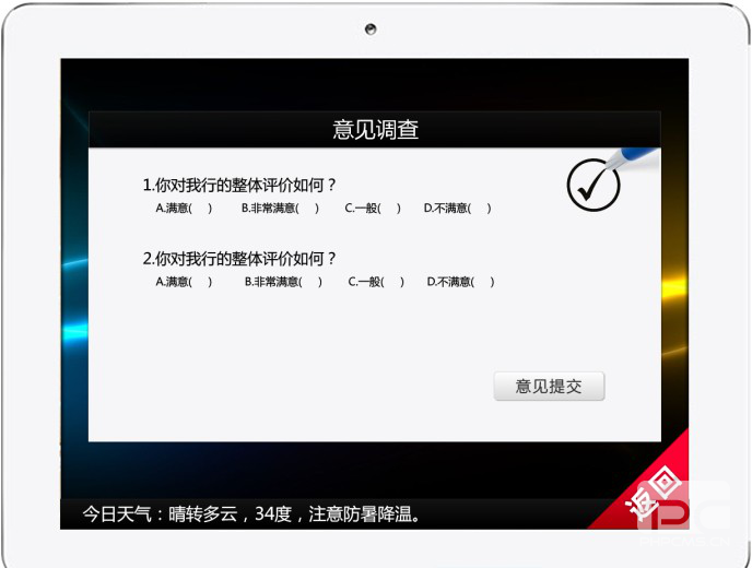 意见调查模块,为您提供对商场品牌店内综合性的意见回收服务。您可以在服务器端设计一套调查问卷,然后通过网络推送都I系列,I系列端用户通过本模块,可以针对调查问卷提交自己的想法。管理人员根据后台统计的调查数据,便可很轻松的了解整个商场近段时间的整体情况。题目全部使用单选题,方便客户做答,总数不超过50,每道题目可选答案不超过9,可选答案可以随意设定。