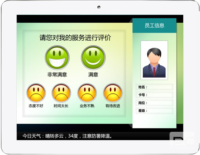 本评价系统借助主流智能移动设备及操作系统平台,采用高端液晶触摸屏,可以实现数据输入、服务质量评价、音视频信息采集,可以同步屏幕显示业务办理信息、TTS语音同步播报,可以发布通知、公告、在特定的时间播放图片或视频的营销宣传展示,还可以动态扩展一些实用的APP应用,如意见调查、顾客投诉等等,能够彻底解决目前营业窗口或柜台存在的一些问题,达到更高的服务水准。